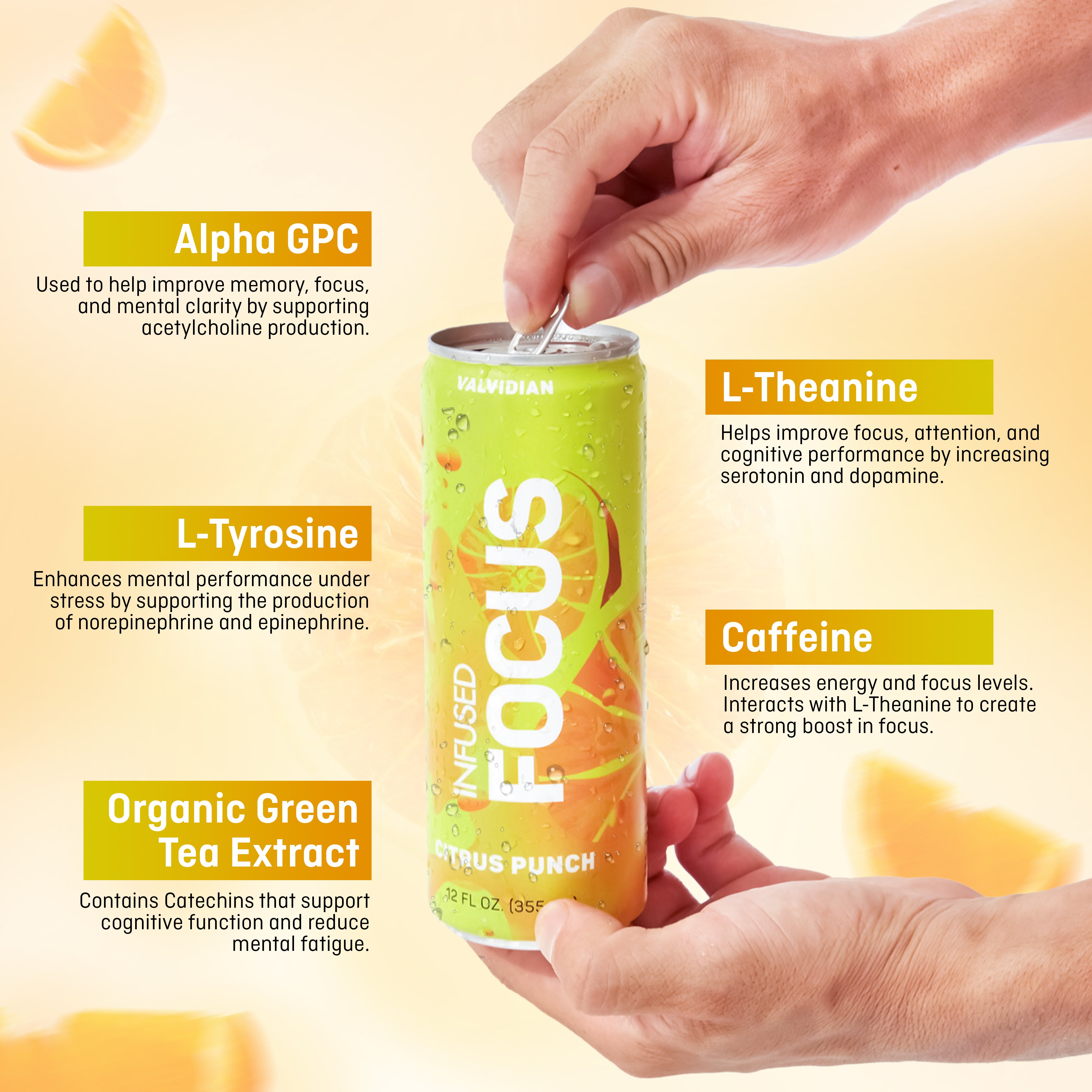 Energy drinks primarily depend on substantial quantities of caffeine, offering little variety in their composition. In contrast, Infused Focus uses proven nootropics such as Alpha-GPC, Green Tea Extract, L-Tyrosine, L-Theanine and more to achieve its efficacy.